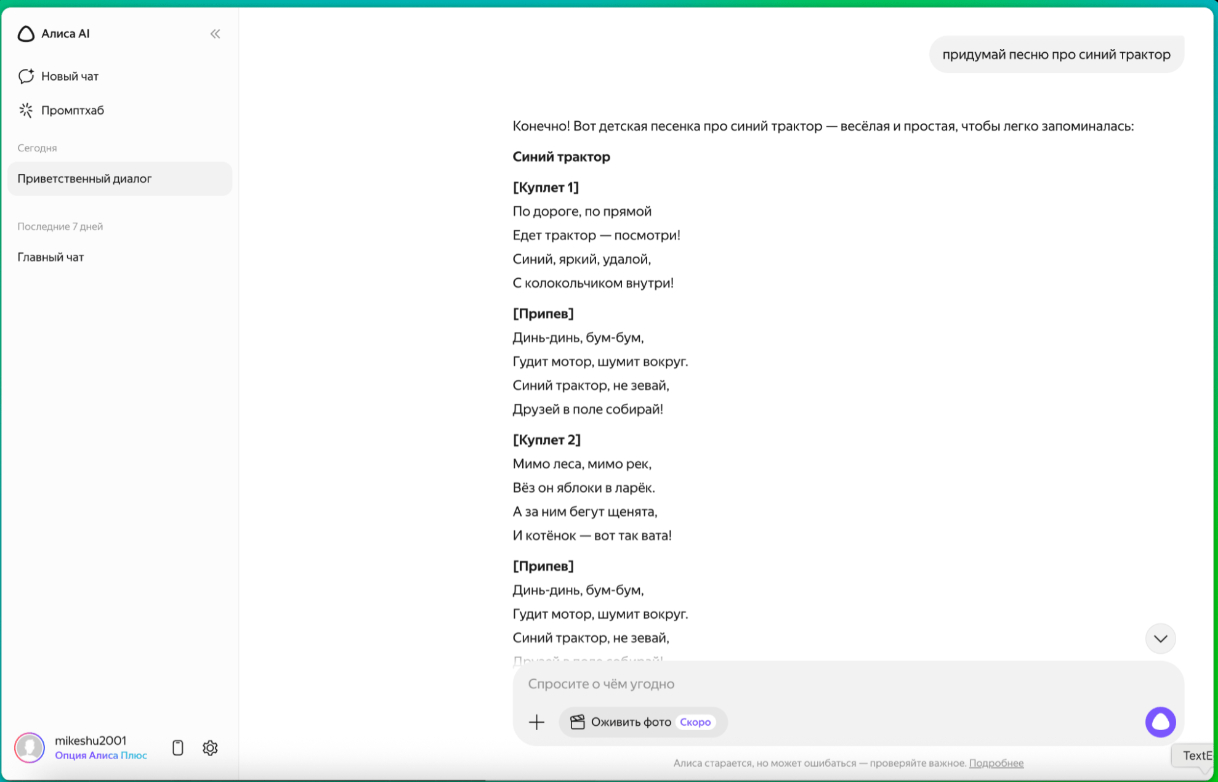Также Алиса умеет искать актуальную информацию через Яндекс Нейро и генерировать изображения на базе YandexART.