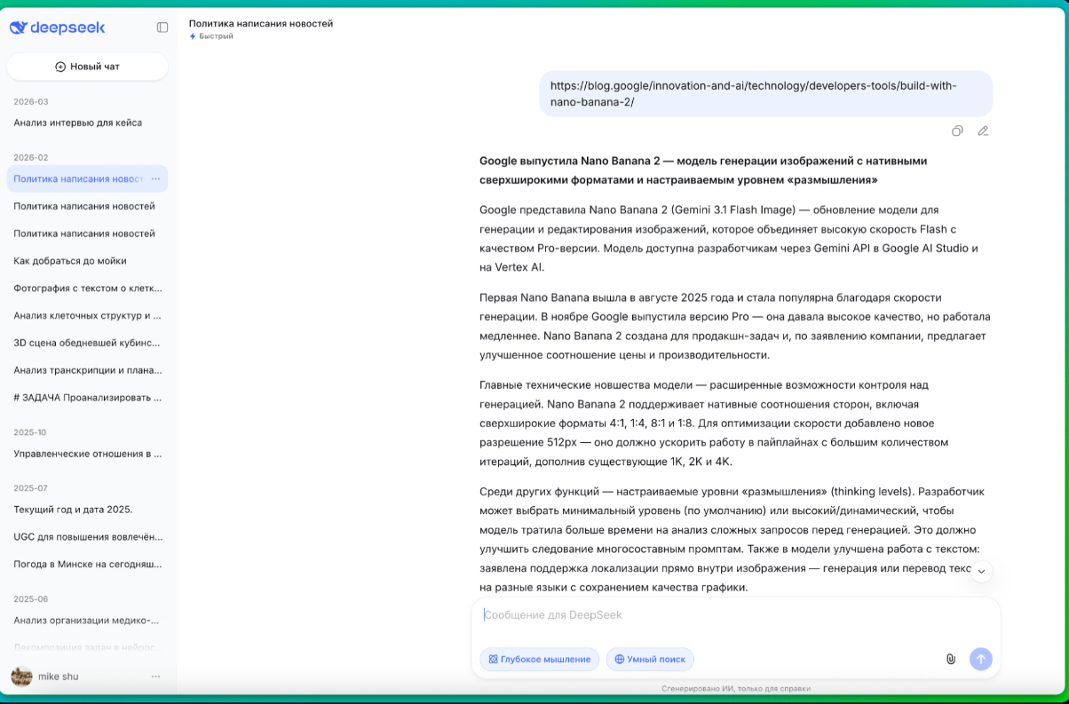 DeepSeek — китайская нейросеть, которая быстро стала популярной благодаря сильной логике и хорошему качеству ответов.