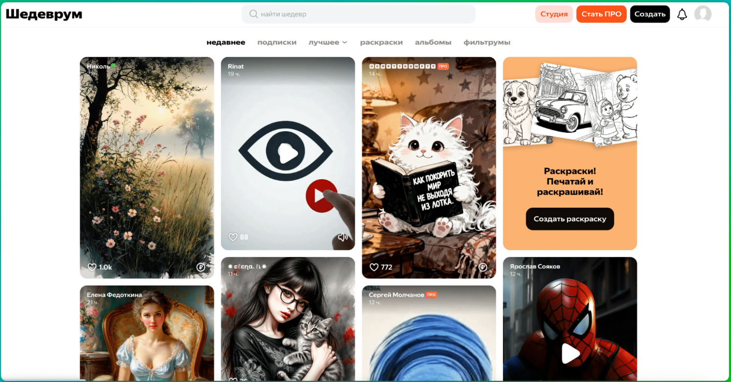 Интересная особенность Шедеврума — встроенная социальная платформа. Пользователи публикуют свои генерации, ставят лайки и обсуждают работы друг друга.