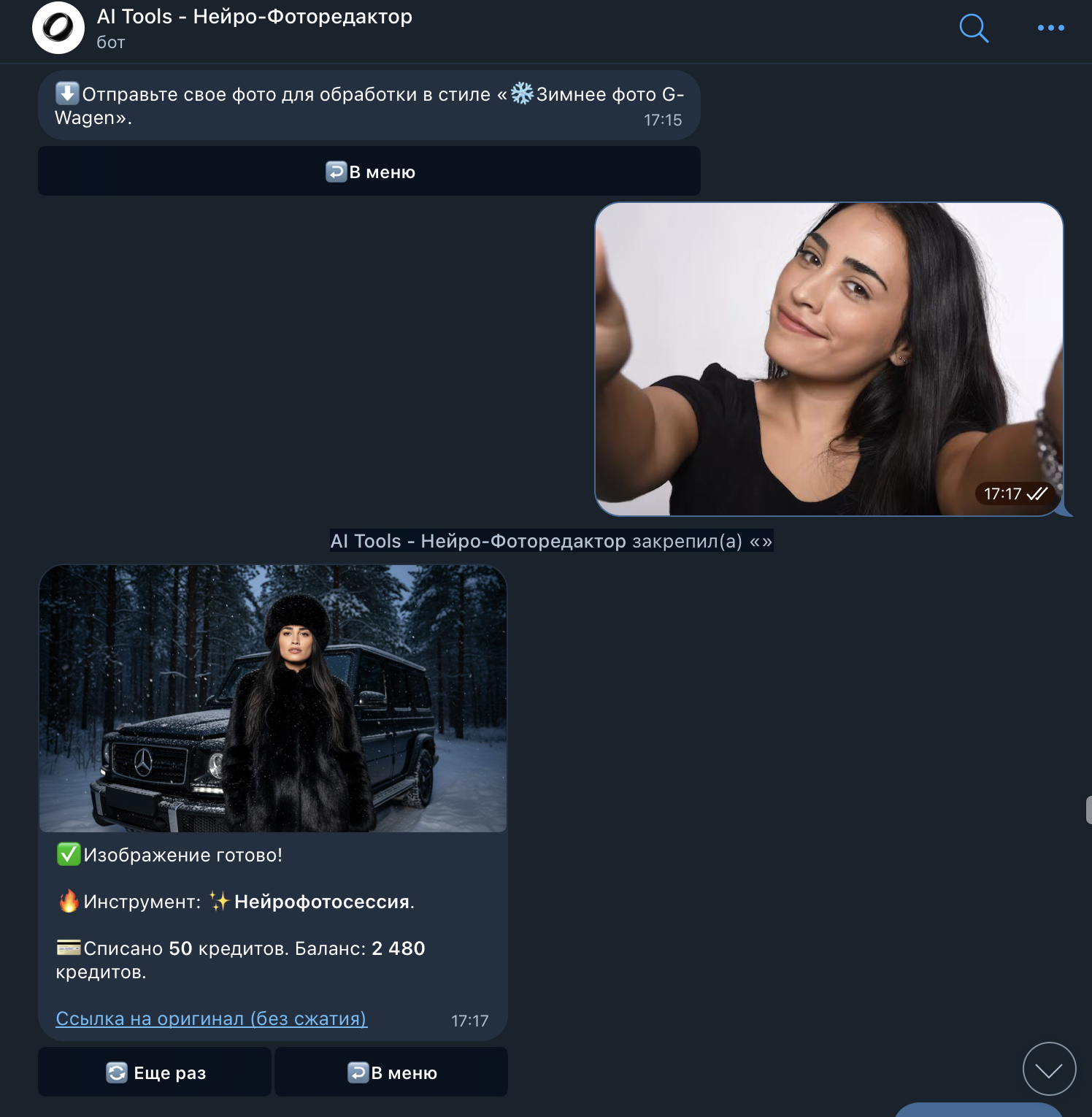 Всё это можно сделать в телеграм-боте AITools. Бесплатные кредиты дают сразу — хватит попробовать и влюбиться.