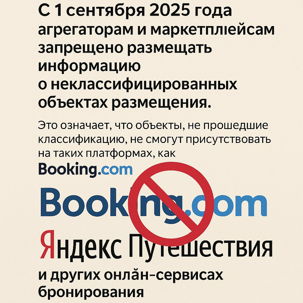 С 1 сентября 2025 года агрегаторам и маркетплейсам запрещено размещать информацию о неклассифицированных объектах размещения. Это означает, что объекты, не прошедшие классификацию, не смогут присутствовать на таких платформах, как Booking.com, Яндекс.Путешествия и других онлайн-сервисах бронирования.