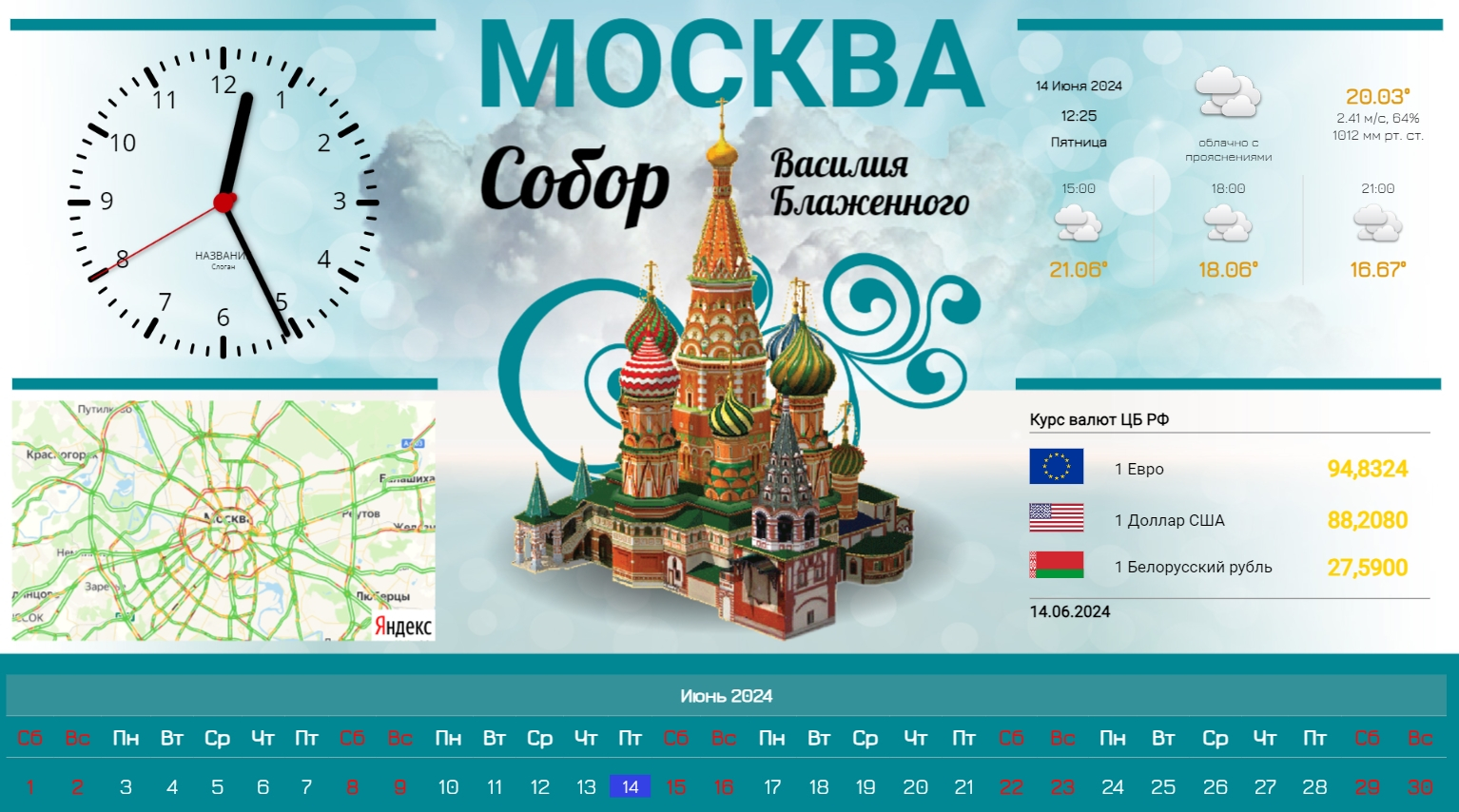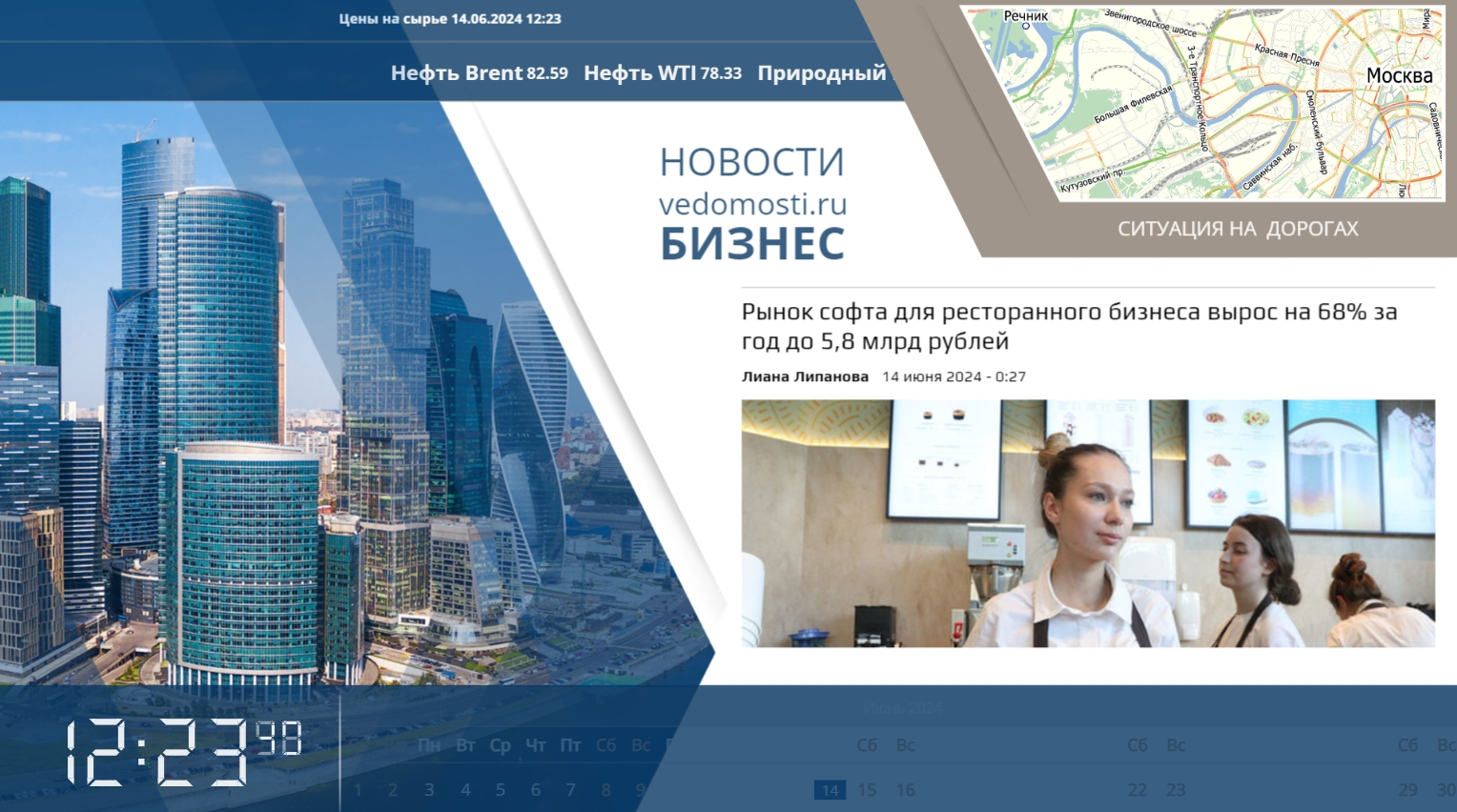Помимо слайдов с состоянием пробок на дорогах, возможно включать слайды со сведениями о мировом времени, погоде, календарными данными, стоимости крупнейших валют и драгоценных металлов. Экран с указанной информацией следует установить таким образом, чтоб посетители обращали на него не только при входе/выходе, но и сидя за столиками, расположившись в местах отдыха.