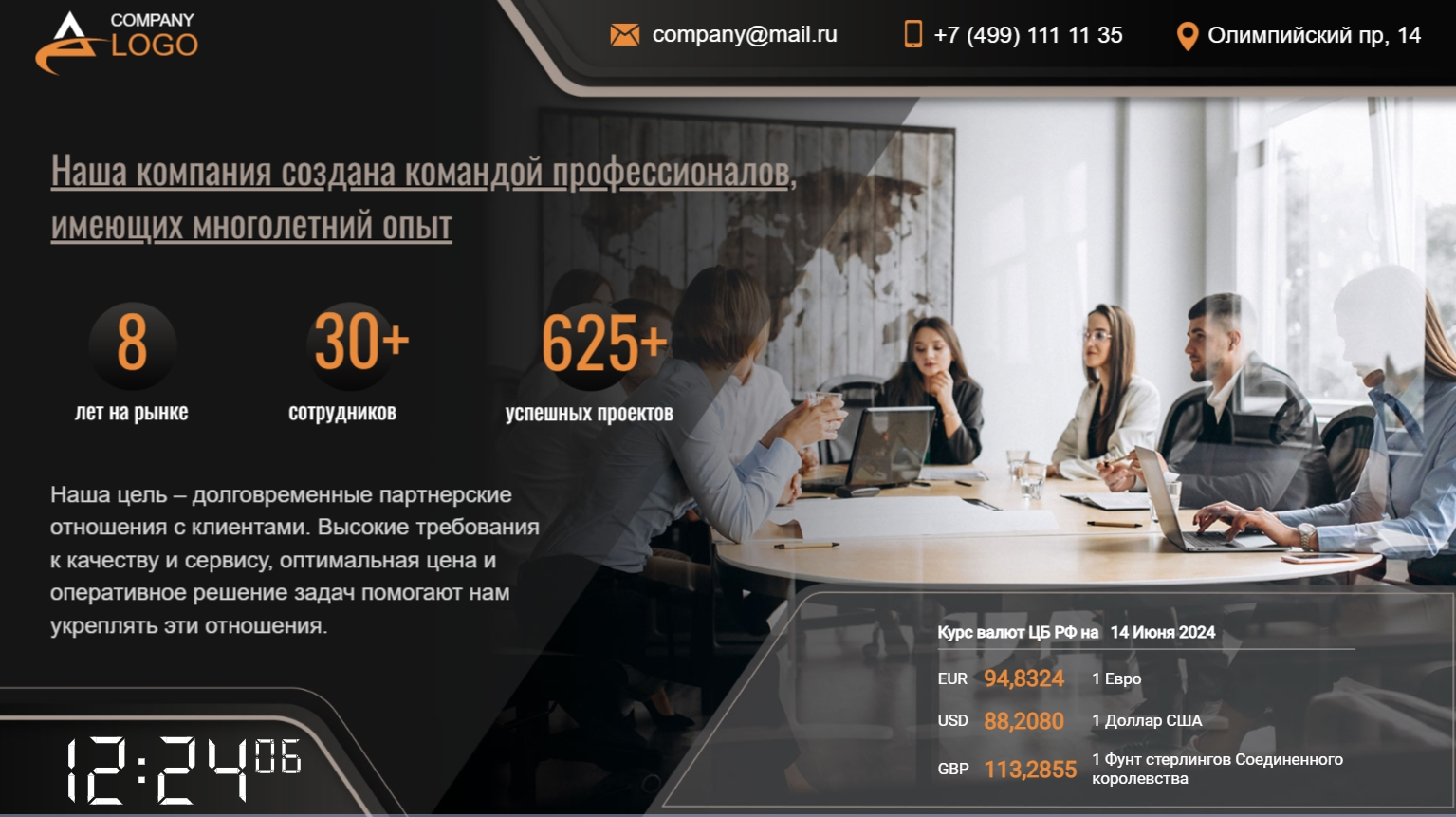 Размещение подобной информации повысить ценность услуг бизнес-центра в глазах их целевой аудитории. Помимо данных о стоимости валюты и драгоценных металлов, на слайдах презентации можно разместить сведения о бизнес центре – адрес, телефон, адрес электронной почты. Для повышения узнаваемости бренда и формирования имиджа бизнес центра в презентацию можно добавить логотип в корпоративных цветах.