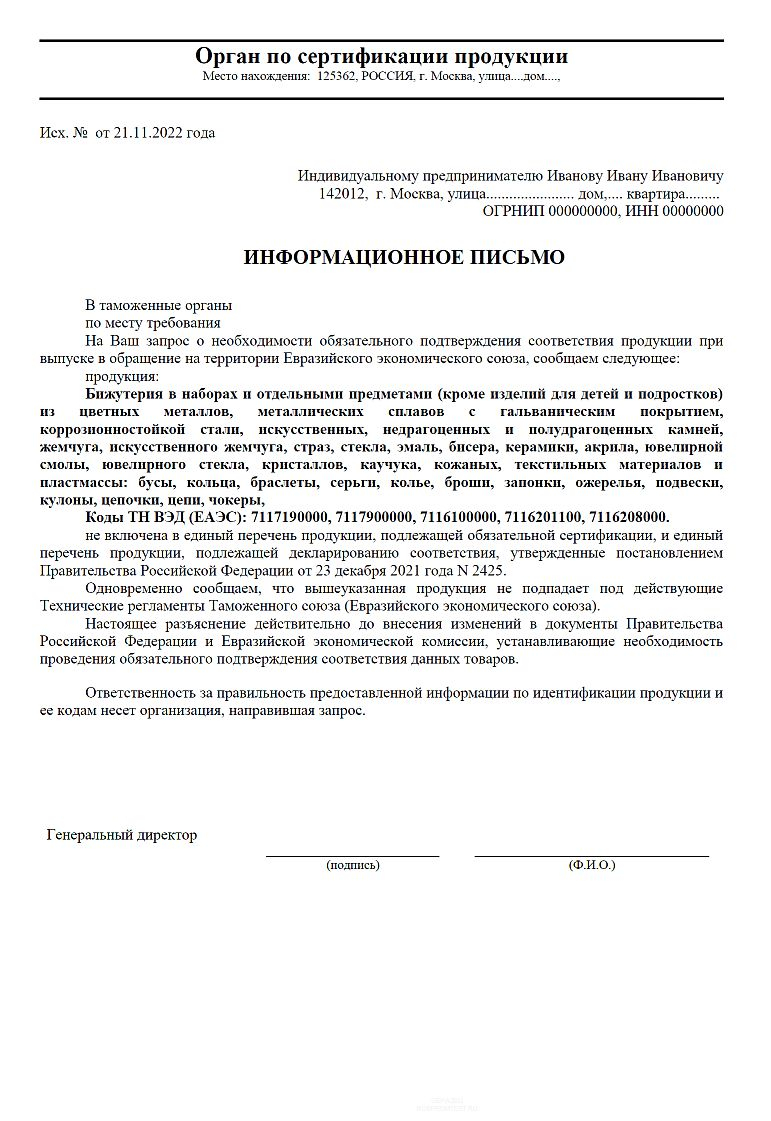 Самый простой и быстрый способ определить, достаточно ли отказного письма на товар, это подать заявку в аккредитованный сертификационный центр. Или же можно просто составит запрос в свободной форме, где необходимо указать продукцию и краткие технические характеристики, включающие область применения и состав.