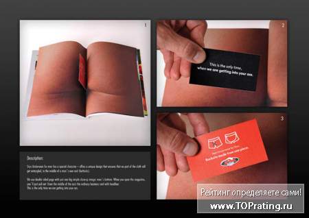 Именно поэтому маркетологи и рекламщики пытаются найти оптимальный вариант подачи рекламы. И тут они уж пускаются во все тяжкие: разместим рекламу на полосе, а еще и на развороте, да и на обложку налепим, или вставку сделаем…а еще...еще… Вариантов множество, и конечно же эффективность несомненно увеличится в несколько раз, только вот каким способ эти данные были подсчитаны, остается загадкой. Зацепить взгляд потенциального покупателя возможно не только с помощью удачного размещения рекламного блока, но и помощью креативных идей, вот например как была прорекламирована разработка сайтов: