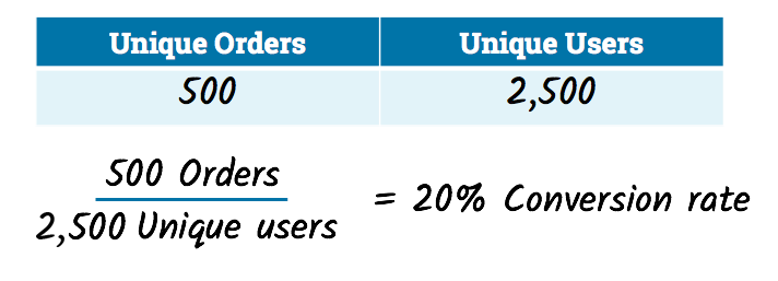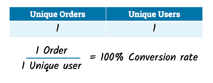 Чтобы определить коэффициент конверсии нашего веб-сайта, мы должны взять количество уникальных заказов и разделить его на количество уникальных пользователей.