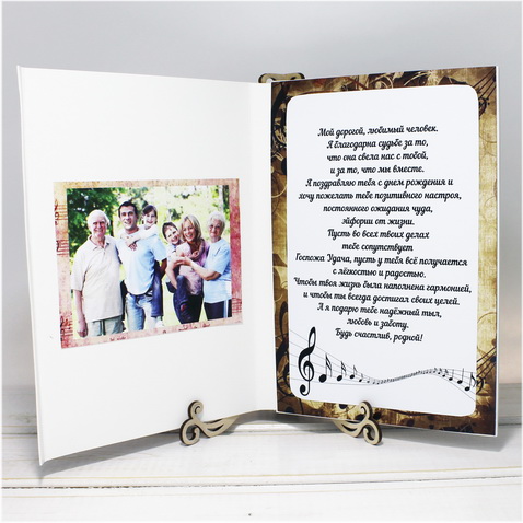 Напомню, что я создал персональные музыкальные открытки на деревянной подставке. Главная фишка в подставке. Теперь открытку можно долго хранить, поставив на стол, полку или камин! Дополнительно, в открытке полный пакет по персонализации (тематика, возраст, текст, фото, аудио). В качестве аудио файла может быть как любимая музыка одаряемого, так и собственный голос, записанный на телефон, диктофон, микрофон. Открытка собирается как конструктор и уже на следующий день может быть у вас!