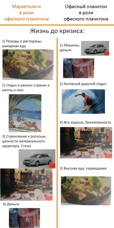 Удивительно похожими оказались картинки сладкой докризисной поры, маркетологи более уверенно квалифицировали это как «роскошь» или стремление к роскоши, офисные работники более скромно говорили о сытости, спокойствии в сочетании с дорогим активным отдыхом…
