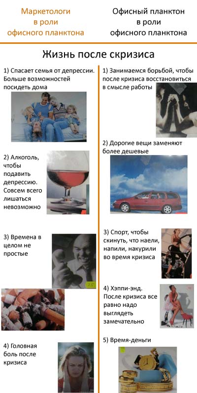 Затем возникло отличие. Для маркетологов в фокусе внимания «посткризисных» картинок оказался стресс и его последствия, а клерки самостоятельно выделили группу под названием «кризис», где поместили наиболее стрессовые картинки. Посткризисное пространство выглядит оптимистичнее: восстановление, возвращение благополучия…