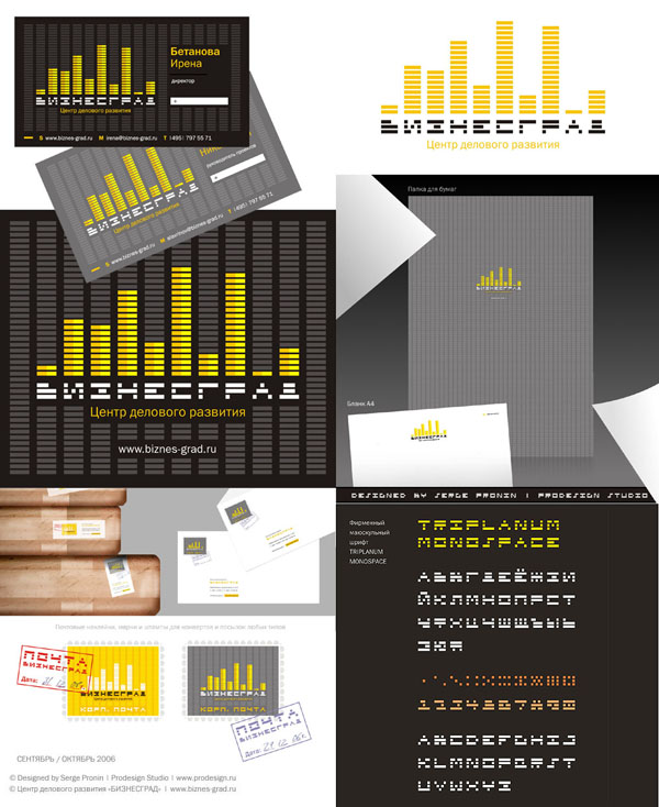 Образный ряд только намечался — диаграммы-индикаторы, вид зданий на горизонте, столбики монеток... И вдруг простая идея к проектированию системы знака и логотипа — количество «кирпичиков» соответствует порядку буквы в алфавите. На удачу в названии нет буквы «я»! Получается внешне хаотичная, но внутренне закономерная конструкция. Буквы подводятся под стиль кирпичиков. И здесь-то меня начинает одолевать желание достроить эту систему до конца. Тем более, всегда хотелось построить собственный шрифт, потому до сих пор и не выбрасываю папки с интересными характерными литерами-каракулями — а вдруг пригодятся! И никогда бы не подумал, что мой первый шрифт будет решен конструктивно вот в таком жестком минимализме. Образовалась целая система по принципу минимального количества элементов в трех горизонтильных линиях. Название решилось само-собой — Triplanum Monospace (шрифт строился как моноширинный). Четкая пропорциональность и закон построения каждой литеры не давали повода ломать голову над вариациями букв — каждая строилась сама-собой. А после создания лого наметился и целый перечень необычных разработок: город-сайт, визитки, наклейки с декоративными штампами на конверты, нестандартных пропорций буклеты, оберточная бумага, открытки, новогодние 2D-«шары» для подарочных настоящих елочек в горшках.
