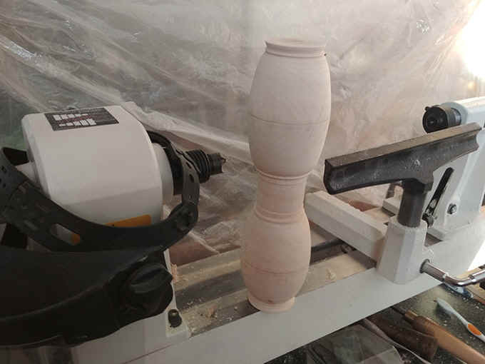 Итак, затеял совместить приятное с полезным — освоить внутреннее точение и заодно сделать что-то интересное. При здоровых бревнах ставлю станок на пол, для спокойствия. С низкой скамеечки очень удобно! Сделал такую гантелину, распилил на стаканчики, приступил к внутреннему точению.