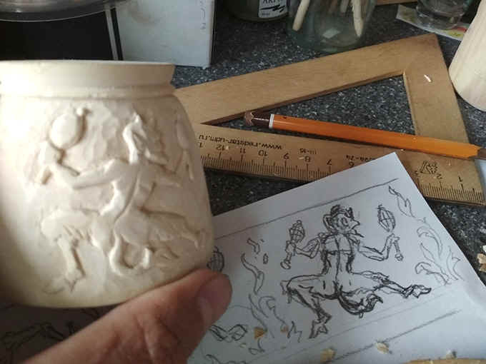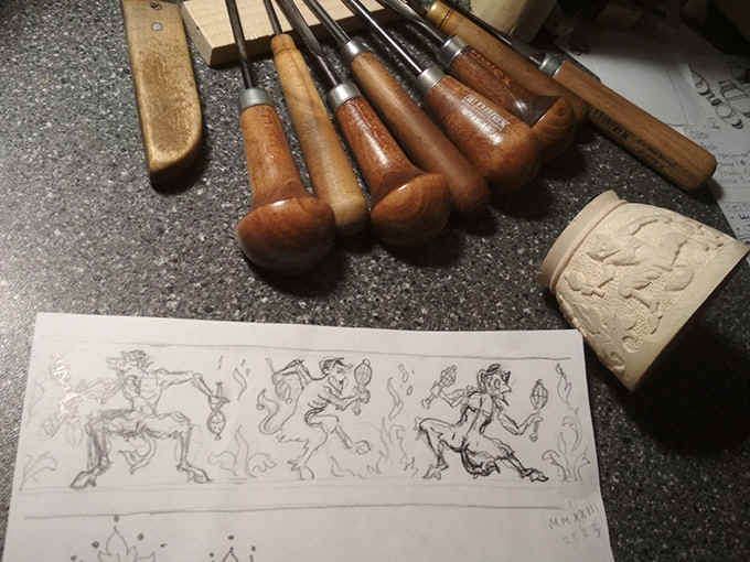 Набросал трех героев-сатиров с погремушками и приступил к резьбе.