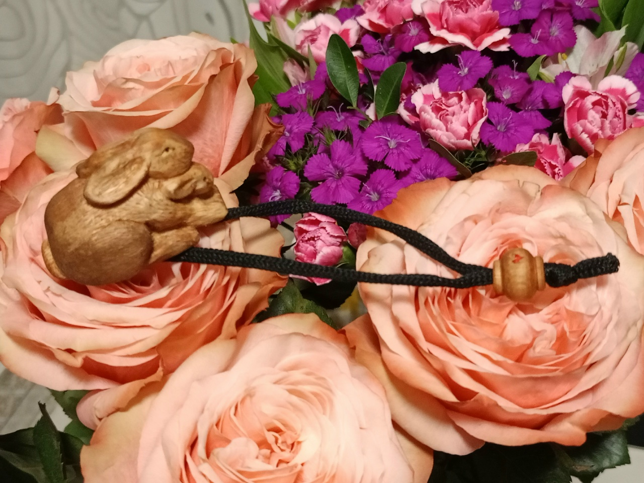 Зайчиха с зайчонком + бусина (сюжет авторский).Размер: 5х3х3 см, красное дерево, масло.Носиться будет как браслет. Полностью ручная работа (и без бор-машины).