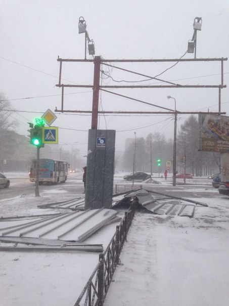 В районе пересечения проспекта Металлистов с улицей Замшиной порывом сильного ветра был снесен рекламный щит. По словам очевидцев, ветер буквально «разорвал его в клочья». Лишь чудом конструкция не задела никого из пешеходов и не повредила припаркованные рядом авто.