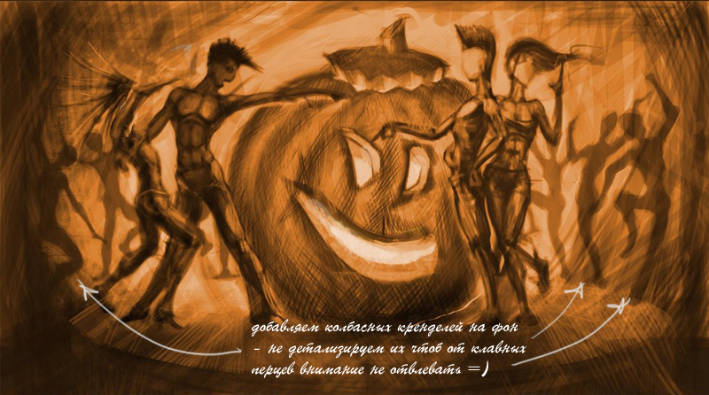 Добавляем колбасных кренделей на фон, не детализируем их, что бы от главных перцев внимание не отвлекать =)