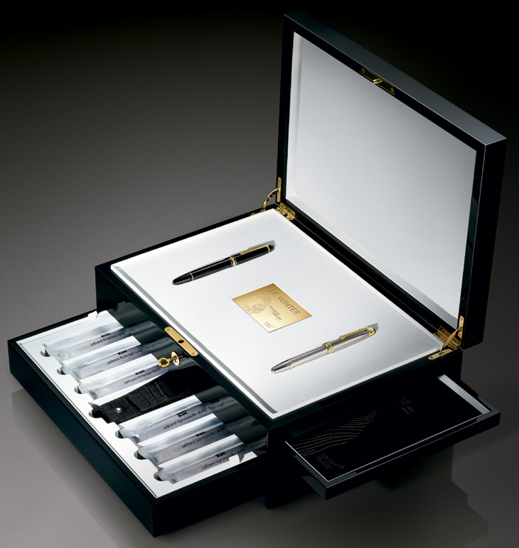 Набор Montblanc Personal Code Ink Set предлагается в персонализированной черной лаковой деревянной шкатулке, где помимо индивидуальных чернил находятся две уникальные ручки и кожаный чехол для их хранения.