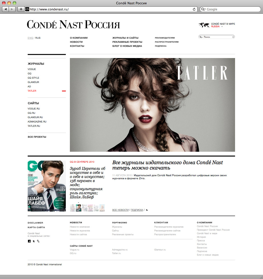 На сайте также появится информация о вакансиях издательского дома, возможность оформить подписку на журналы Glamour, Tatler, AD, GQ, GQ Style и Vogue. У Сondé Nast появится и свой аккаунт в Twitter (Twitter.com/condenastrussia) и группа на Facebook (Facebook.com/condenastrussia), чтобы клиентам и партнерам было удобней читать новости издательского дома. На все обновления на сайте можно также подписаться через RSS-ленту.