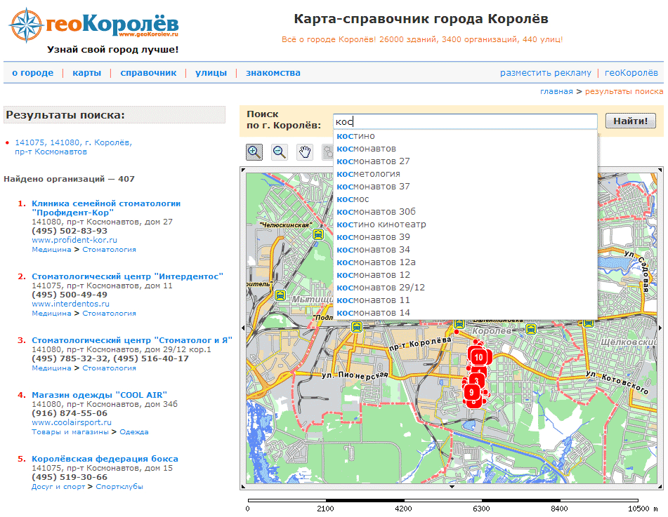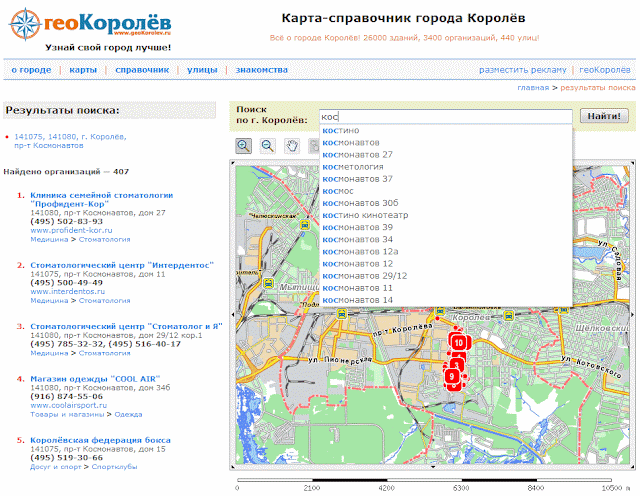 Причём в начале списка всегда стоит то, что наиболее часто ищут люди на геоКоролёв, и Вам в процессе набора запроса, с очень большой вероятностью понадобиться именно то, что стоит вверху. Поэтому набор происходит быстрее, что важно – орфографически и грамматически правильно и часто без дополнительного ввода текста с клавиатуры. Это легче показать чем описать словами – "поисковые подсказки" на геоКоролёв выглядят так:
