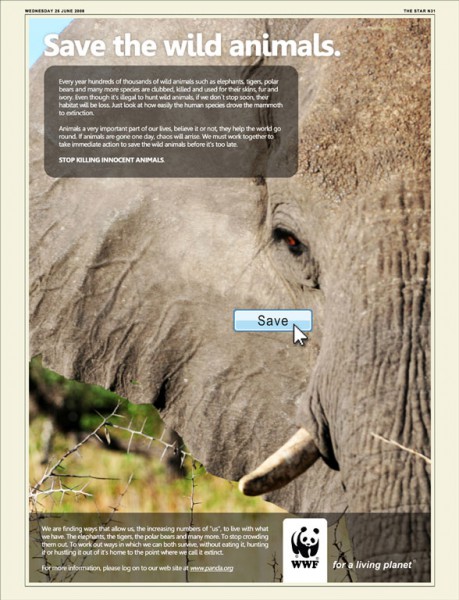 Бесспорным лидером и обладателем самой оригинальной и выполненной со вкусом социальной рекламы является Всемирный фонд дикой природы (WWF). Их плакаты – сочетание тонкой мысли и детальной проработки. Это та реклама, которая действительно заставляет задуматься!