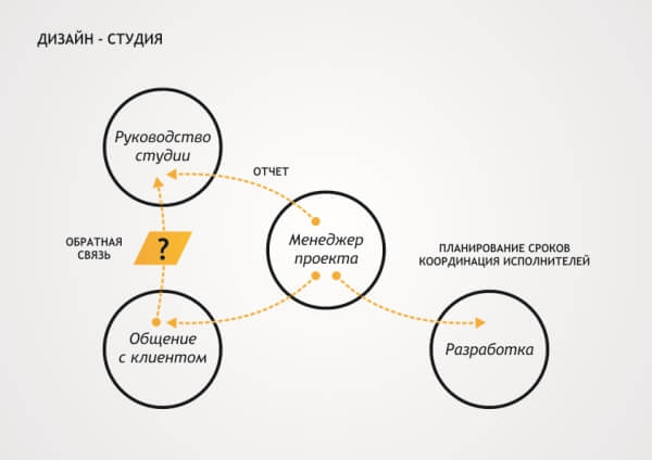 Связующим звеном между исполнителями и клиентом выступает аккаунт-менеджер, который, с одной стороны, отвечает за формализацию задачи клиента для исполнителей и, с другой, обеспечивает контроль качества и соблюдение сроков сдачи проекта клиенту.