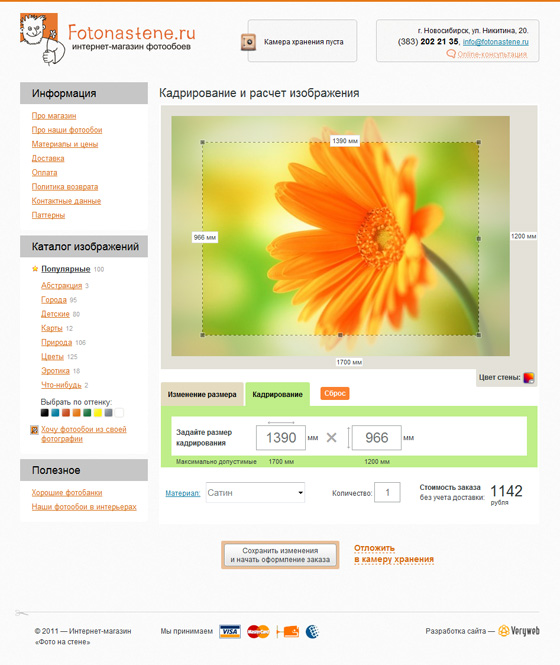 Кадрирование - самый главный инструмент. Выбрав понравившееся изображе из каталога или загрузив своё можно его подогнать под нужный размер: подрезать по краям, сверху, снизу, указать размеры печати скадрированного участка. В общем, изображение подгоняется под физический размер места наклеивания.