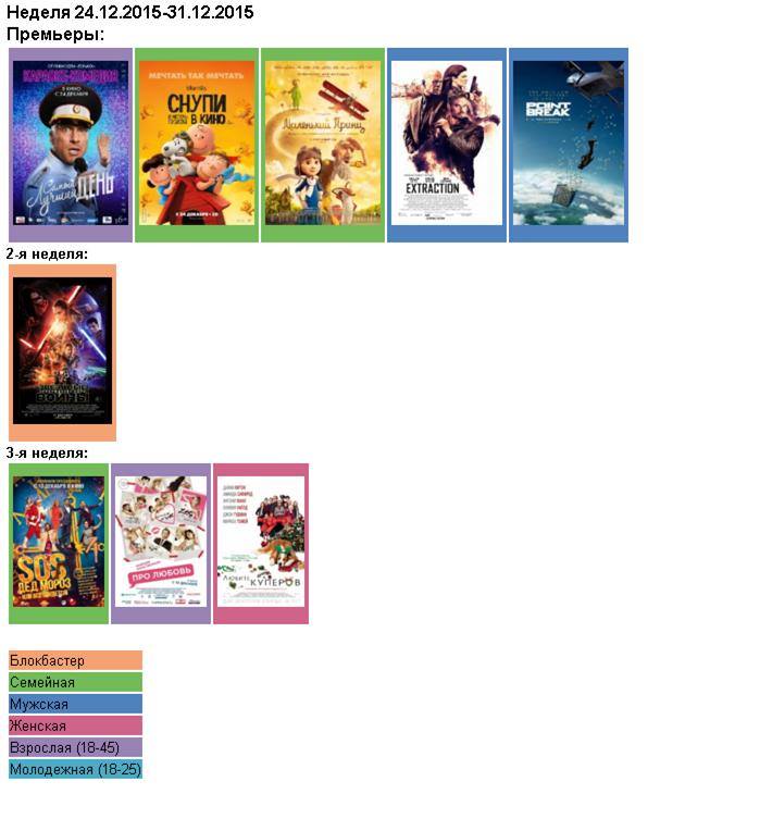 бесстрашно, на второй неделе проката "Звездных войн" с надеждой на долгие зимние каникулы в прокат выходят: наша Дмитрий-Нагиев-поет-с-нами караоке-комедия "Самый лучший день" для взрослой аудитории, "Маленький Принц" и "Снупи и мелочь пузатая в кино" для семейной аудитории, и для мужчин целых две картины 16+помните-с-Патриком-Суэйзи-и-Киану-Ривзом боевик "На гребне волны" и 18+Брюс-Уиллис-дорогу-молодым боевик "Экстракция".