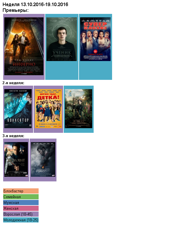 Для молодежной аудитории выходят: драма Кирилла Серебрянникова "Ученик" (www.kinopoisk.ru/film/ 922150) и наша антигеройская трешкомедия "Суперплохие" (www.kinopoisk.ru/film/893627).