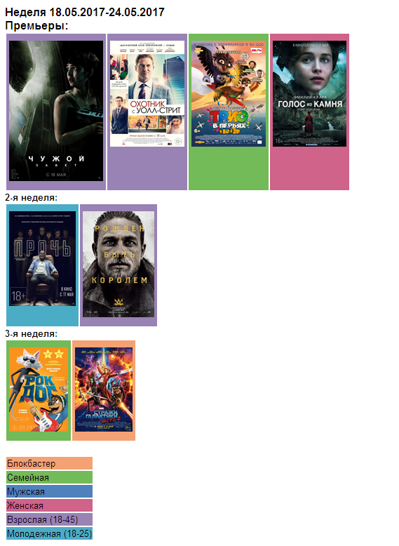 Вторую неделю будут работать: Гай-Ричи-фэнтези "Меч короля Артура" для взрослой аудитории (https://www.kinopoisk.ru/film/824437/) и молодёжные ужасы "Прочь" (https://www.kinopoisk.ru/film/944708/).