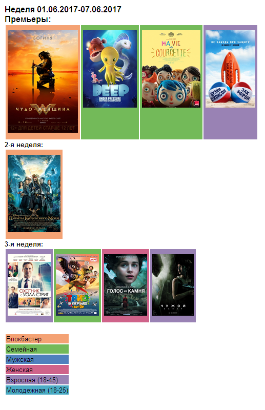 В прокат выходят: супергеройский блокбастер "Чудо-женщина" (https://www.kinopoisk.ru/film/102383/) и Памела-бич-Дуэйн комедия "Спасатели Малибу" (https://www.kinopoisk.ru/film/468940/) для взрослого зрителя.