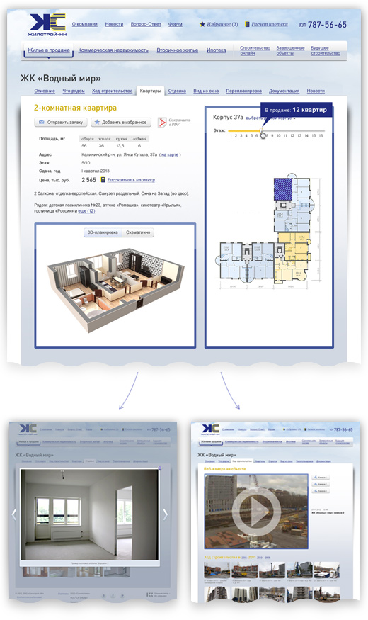 Каталог квартир помогает покупателям быстрее принять решение. Помимо привычного подбора по цене, площади и другим параметрам сайт содержит визуальный выборщик квартир по домам и планам этажей. По каждой квартире также предоставлена исчерпывающая информация, включая картинки с планировками и описание инфраструктуры района. Чтобы упростить поиск наилучшего предложения, сайт предлагает посмотреть похожие квартиры — по цене, количеству комнат или площади.