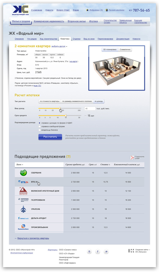 Один из ключевых разделов сайта — информация о кредитных программах, банках-партнерах и ипотечный калькулятор. Калькулятор позволяет легко подобрать и сравнить варианты кредитов, взносов и ежемесячных платежей.