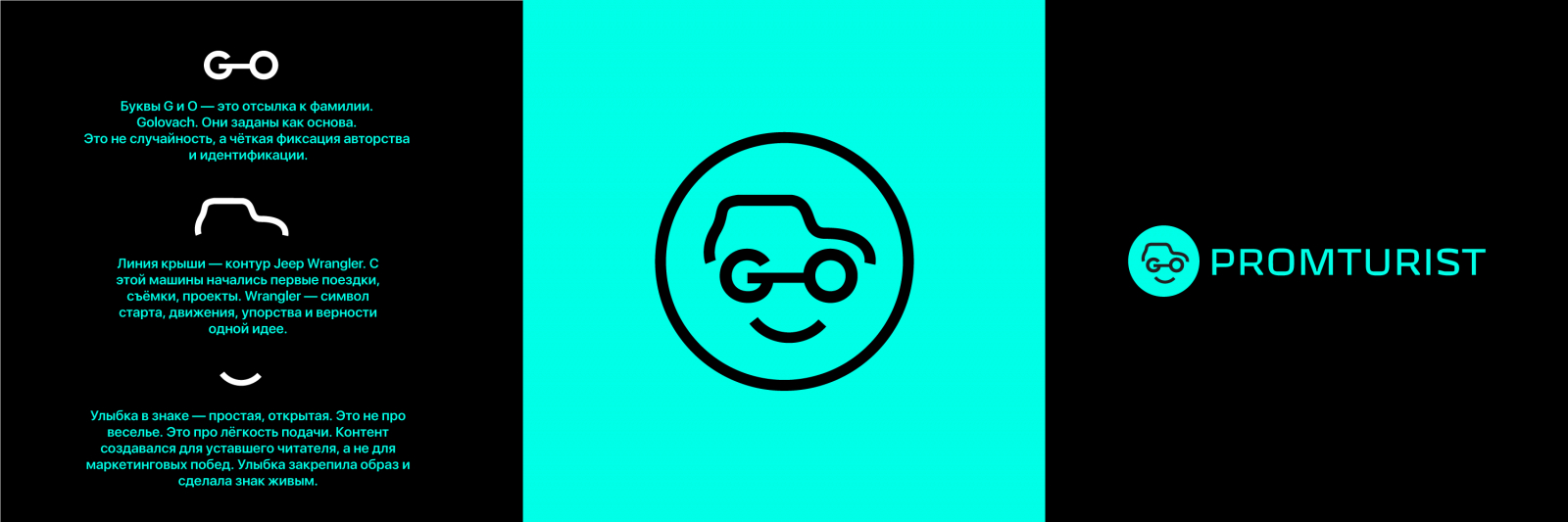 Логотип — улыбающийся автомобиль с колёсной парой в виде букв G—O. Улыбка делает образ дружелюбным и запоминающимся.