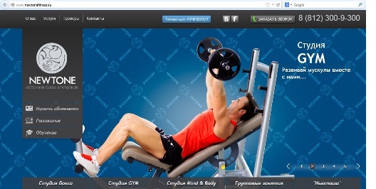 Между тем, при изготовлении сайта для фитнес-студии NEWTONE веб-компания «Медиасфера»» обратилась именно к ней, и при загрузке сайта красивая анимированная картинка – это первое и основное, что мы видим. Конечно, «Медиасфера» оптимизировала сайт в соответствии с современными нормами оптимизации: основной телефон вынесен в шапку, есть возможность заказать телефонный звонок, сразу видны плашки групп в социальных сетях. Но зачем же такая насыщенная отвлекающая анимация для компании, которая оказывает услуги?
