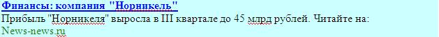 В качестве примера можно рассмотреть публикацию на сайте BFM.RU, сообщающую о росте прибыли «Норникеля» (Статья вышла под заголовком «Прибыль «Норникеля» выросла в III квартале на 45 млрд. рублей»). Система автоматически формирует контекстное объявление согласно тегам и заголовку статьи, выглядеть это будет следующим образом: