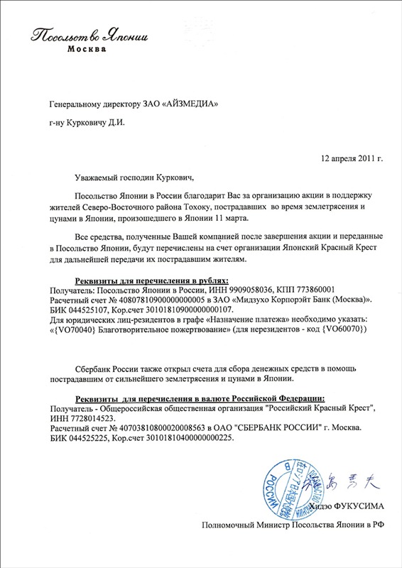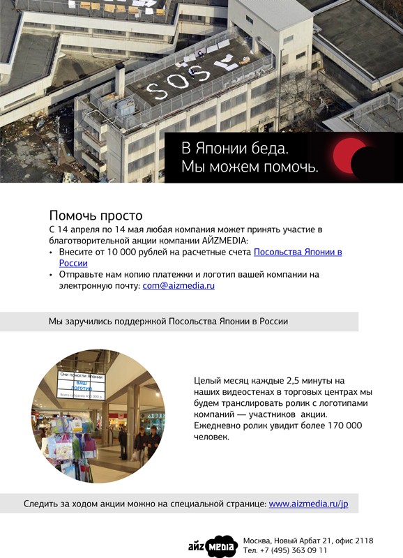Заручившись поддержкой Посольства Японии в России, с 14 апреля по 14 мая АЙZMEDIA проводит благотворительную акцию.
