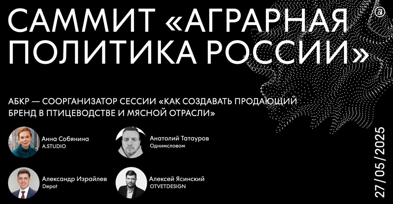 Сессия АБКР «КАК СОЗДАВАТЬ ПРОДАЮЩИЙ БРЕНД В ПТИЦЕВОДСТВЕ И МЯСНОЙ ОТРАСЛИ» состоится 27 мая с 14:00 по 15:30. В числе спикеров: Анна Собянина (A STUDIO), Александр Израйлев (Depot), Анатолий Татауров (Однимсловом), Алексей Ясинский (OTVETDESIGN).