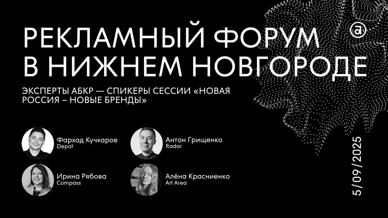 5 сентября эксперты АБКР Фархад Кучкаров (Depot), Ирина Рябова (COMPASS), Алёна Красниенко (Art Area) и Антон Грищенко (Radar) выступят в секции по брендингу в рамках XXV рекламного форума в Нижнем Новгороде. АБКР — партнёр мероприятия.