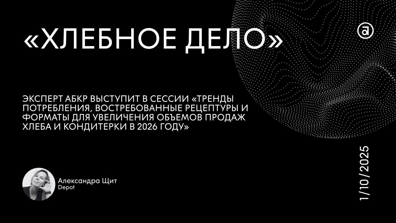 1 октября при поддержке АБКР состоится всероссийский форум хлебопекарной и кондитерской промышленности «Хлебное дело», проходящий в рамках Международной выставки «Агропродмаш-2025». Эксперт АБКР Александра Щит (Depot) — спикер форума.