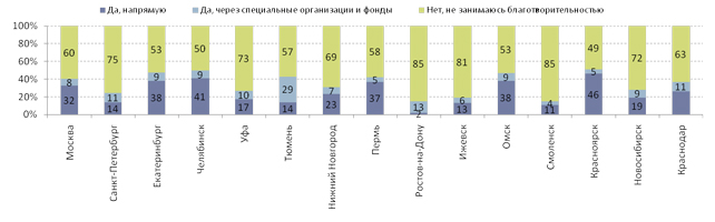 Доля предпринимателей по отраслям занятости, участвующих в благотворительной деятельности, в среднем одинакова: от 32% в сфере услуг до 40% в промышленном секторе. Наибольшее число бизнесменов-благотворителей выявлено в Красноярске, Челябинске, Екатеринбурге, Омске и Перми.