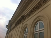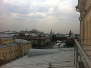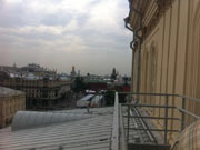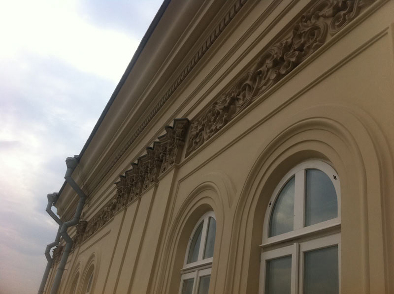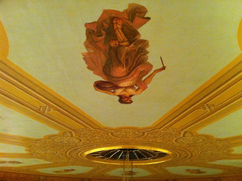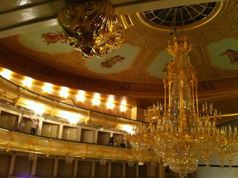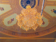 А смотреть на потолок можно только затаив дыхание. Хрустальная люстра огромных размеров с позолотой приводит просто в невероятный восторг! Невозможно оторвать взгляд. Размеры люстры шокируют. Говорят, что ее диаметр - 6 метров, а вес - 3 тонны, причем одна тонна - это хрусталь! Поражают и восстановленные росписи «Аполлон и музы».