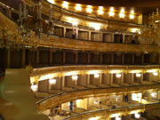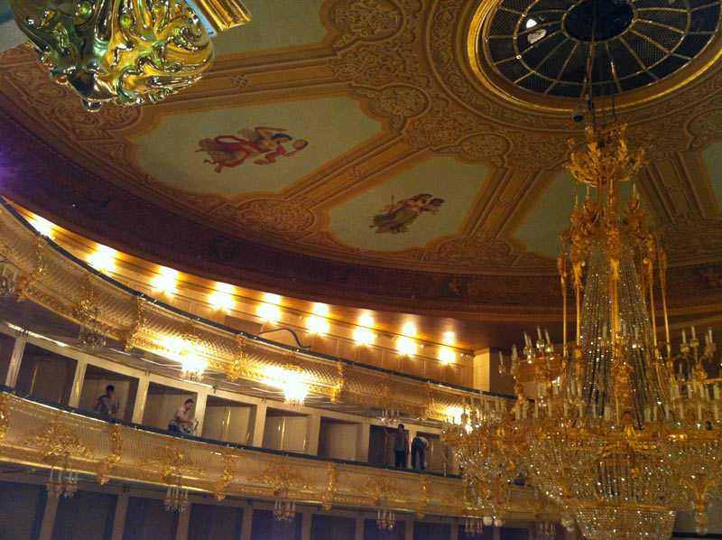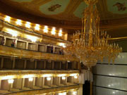 Сразу же поразили интерьеры: царской ложи с позолоченной лепниной в центре зала, мебель, отделанная бархатом под старину, деревянные колонны. Если верить реставраторам, 98% здания сохранено полностью, каким оно было в восстановленом после пожара в 1856 году. Все здесь, начиная с конструкции оркестровой ямы и заканчивая материалами для обивки кресел, способствует улучшению акустики зрительного зала.