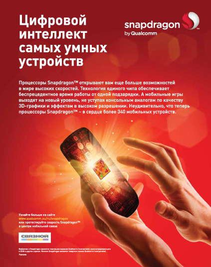 Рекламная кампания Snapdragon FY12 включает размещение стандартных и нестандартных баннеров на площадках категорий Gaming, Mobile, Hi-tech, а также в тематических сетях. Поисковая реклама также является неотъемлемой частью рекламной кампании. Размещение в принте представлено как мужскими глянцевыми журналами (Top Gear, Maxim, Men`s Health), так и узкотематическими (Stuff, T3, Computerbild, Chip и другие).