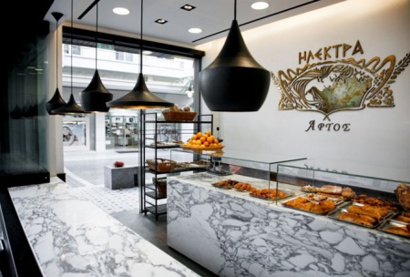 В северной части Греции расположена уникальная пекарня Elektra. Главная особенность данного заведения – необычный, даже неожиданный дизайн – стеклянные стены, темные оттенки стен и мебели – все это напоминает престижный ресторан. Вся продукция демонстрируется покупателям и посетителям заведения в витринах и шкафах, корпусы которых напоминают элегантные мраморные композиции. Освещается торговый зал при помощи грушевидных черных светильников.