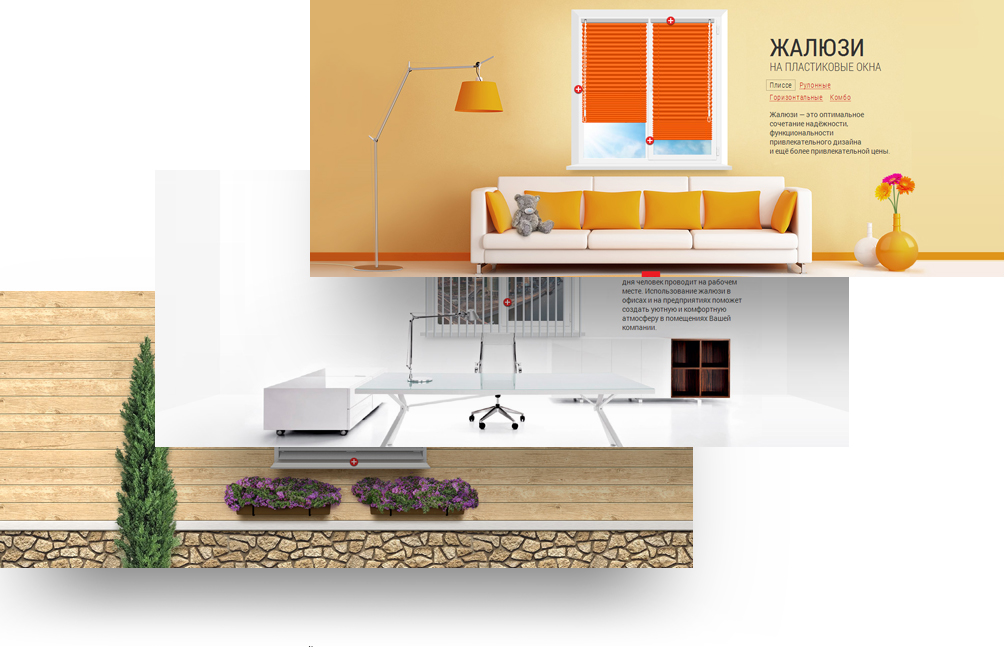 В основу концепции сайта легла идея демонстрации систем жалюзи в интерьерах. Мы показали, как системы защиты от солнца делают функциональным загородный дом, помогают создать домашний уют или офисную строгость.