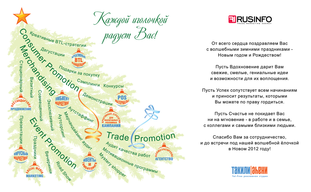 Fat-free рекламная студия ТАКИЛИИНАЧЕ и трейд-маркетинговое агентство RUSINFO желают вам новых креативных идей, приносящих новые реальные деньги!:)
