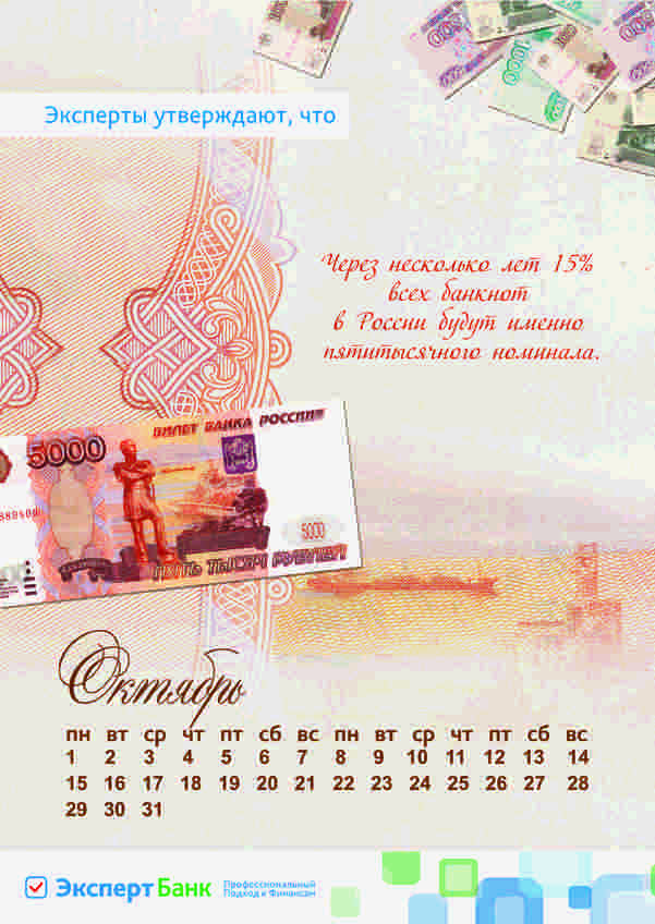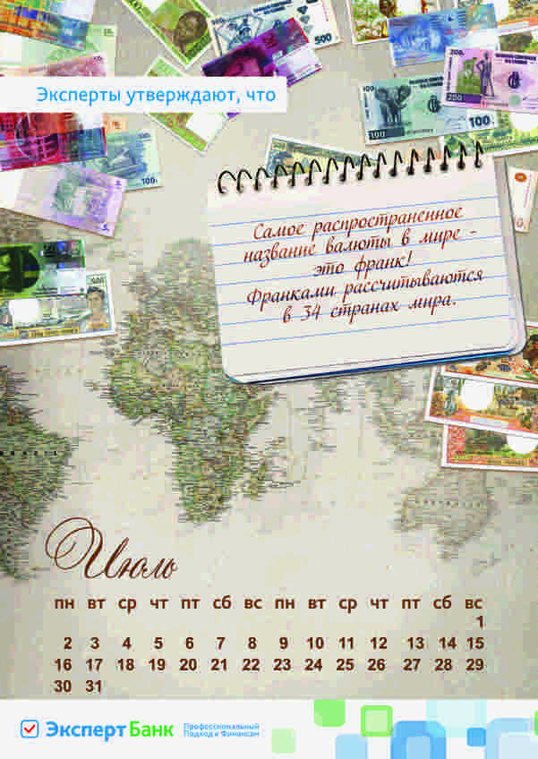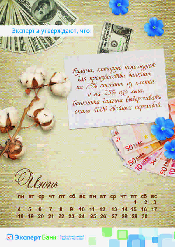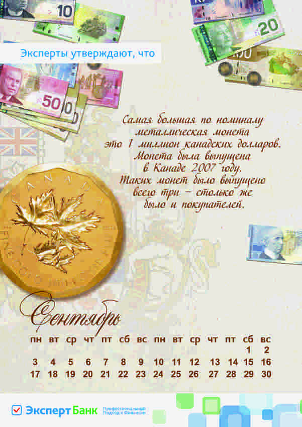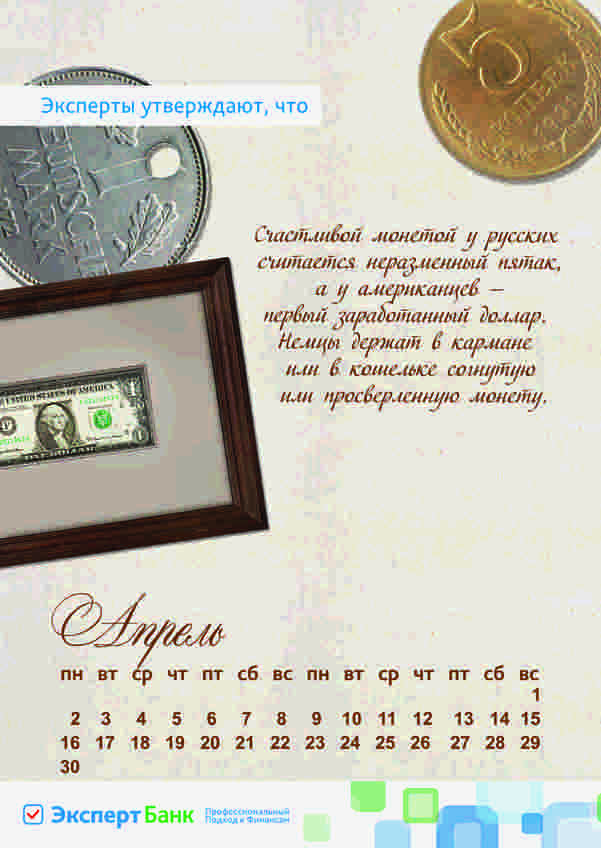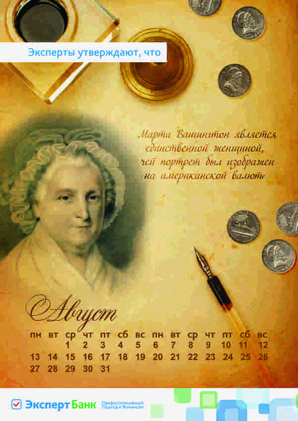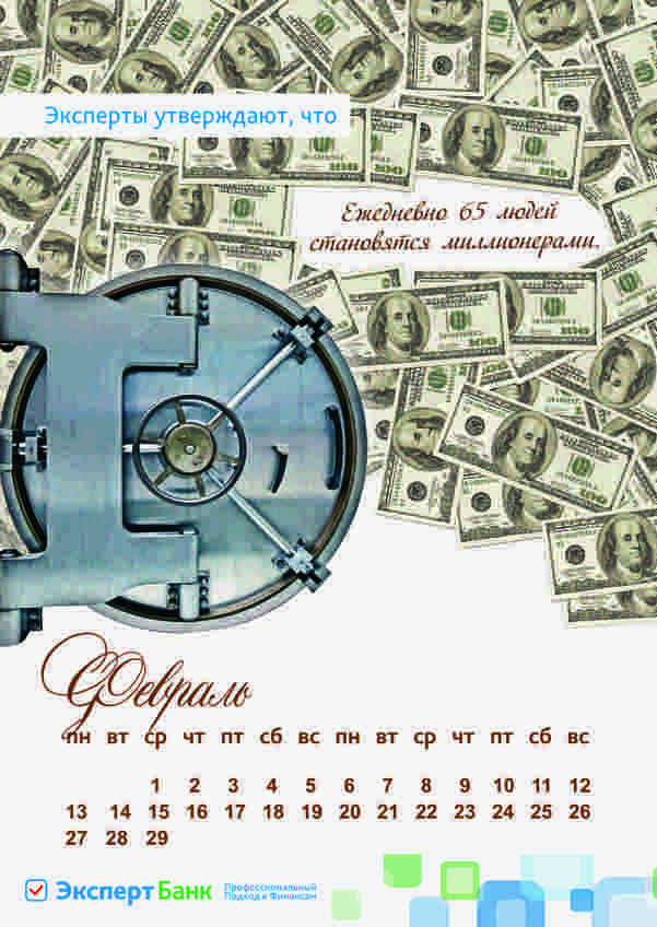 В большом настенном календаре обыграно название Банка – он выступает экспертом во всем, что касается финансов. Поэтому на каждой странице представлены интересные факты, связанные с деньгами, экономикой, банковской сферой, известными бизнесменами, и так далее. К каждому факту прилагаются соответствующие иллюстрации, выдержанные в едином строгом стиле. Карманные календари и поздравительные открытки выполнены в более лаконичной манере – ничего лишнего.