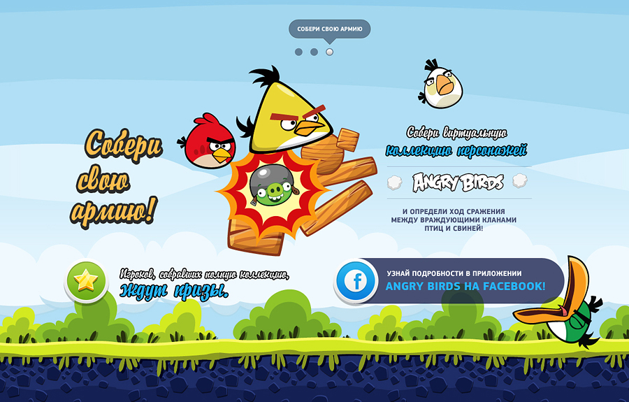 Выстрел птичкой из рогатки – сейчас самая известная игровая механика, знакомая миллионам обладателям смартфонов. Поэтому мы дали пользователям возможность поиграть прямо внутри баннера. Хватаете понравившуюся вам птичку, запускаете ее в полет и переходите на промо-сайт Samsung Smart TV. Скроллите сайт и узнаете, когда в ближайшей к вам интерактивной зоне пройдет турнир по Angry Birds вместе с angry-танцами и angry-викториной.