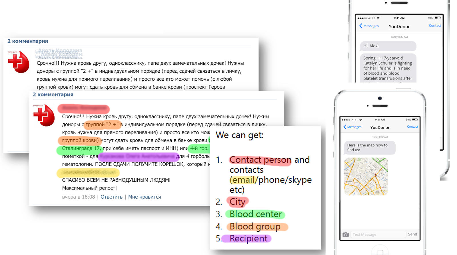 АК: Мы ищем сообщения двух типов: сообщения о желании сдать кровь и сообщения о поиске доноров. Недавно добавили мониторинг сообщений на тему корпоративного донорства - хотим знать "в лицо" компании, которые это практикуют.