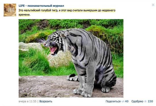 Что же делать со спорными фактами и можно ли показывать их читателям? Конечно можно! Нельзя же всегда отказываться от «вкусной» истории или интересной легенды. Просто преподносите такой материал таким образом, что «есть некое мнение»». Например: «Существует легенда, что…», «Считается, что…», «По информации оттуда-оттуда…» и пишете сам материал, задавая в конце самый уместный здесь вопрос: «А как вы считаете, это так?». Помимо благодарности за то, что вы не вводите подписчиков в заблуждение, а напротив, считаетесь с их мнением, вы получите гарантированно высокую активность под подобными постами. Только не переусердствуйте! Этот совет касается противоречивых, а не заведомо лживых материалов или сфабрикованных фотографий, как любимый пабликами ВКонтакте голубой тигр:
