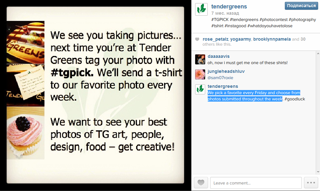 Tender Greens – сеть эко-ресторанов в США. Они проводят фотоконкурсы посетителей своих ресторанов в Instagram. Условия конкурса: нужно выложить фото, сделанное в заведении, и указать специальный хэш-тег. Победитель выбирается администрацией ресторана каждую неделю и получает бесплатную футболку.